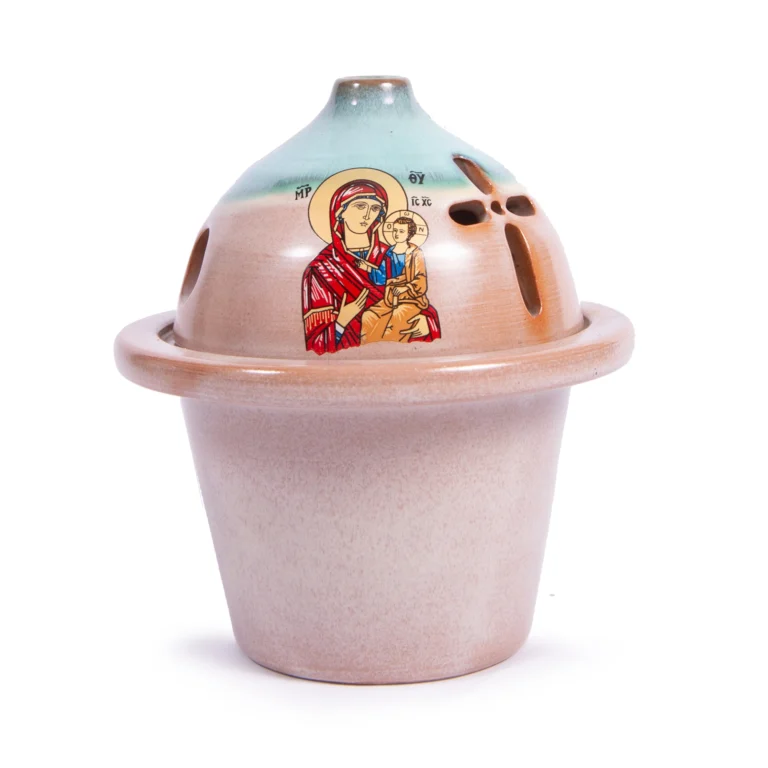 Ανακαλύψτε το όμορφο και παραδοσιακό πήλινο καντήλι Παναγία, ιδανικό για τη χρήση στο σπίτι, στο παρεκκλήσι ή ως δώρο για
